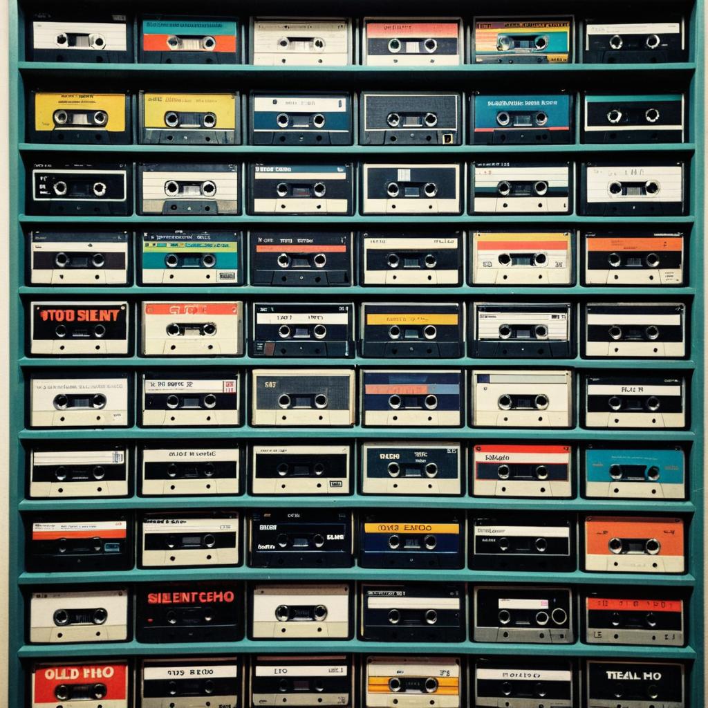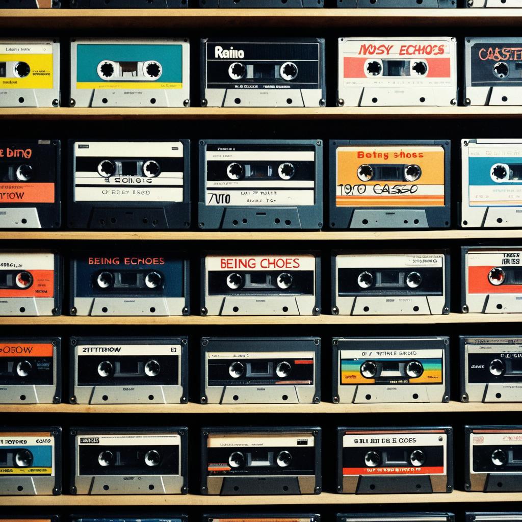 Focus Shot On The Style Inspired Clothing, a shelf containing old cassette tapes in their respective cases, all labeled with real 1970s band names; in the style of a minimalist movie poster, with the title of the movie being Silent Echo, in colorful letters.