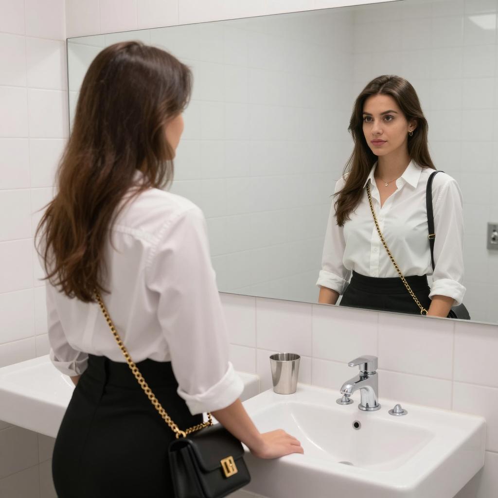 Young woman with long brown hair, white shirt, black skirt, and black crossbody bag with gold chain, stands at bathroom sink. She faces mirror, reflecting her face. Three white sinks, silver faucets, and stainless steel cup are below. White tiled walls. She stands with her back to the camera, looking at her reflection.