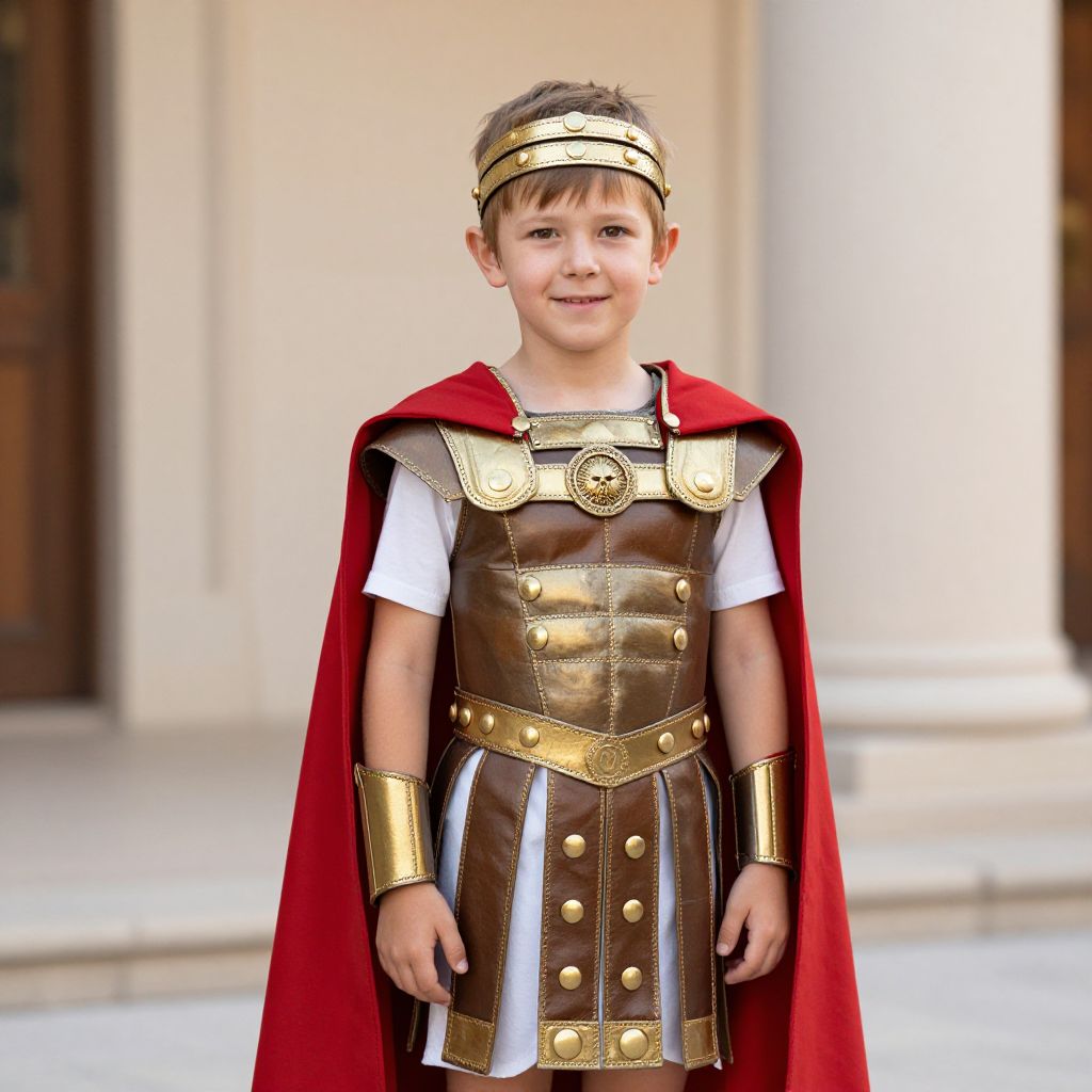 Photograph of a young Caucasian boy with short brown hair wearing a Roman gladiator costume. He has a gold headband, a red cape, and a brown leather tunic adorned with gold buttons and a white shirt underneath. His costume includes gold arm cuffs and a round medallion on his chest. He stands in front of a beige building with a wooden door, smiling slightly. The background is slightly blurred, focusing attention on the boy and his outfit. The lighting is natural, highlighting the boy's cheerful expression.