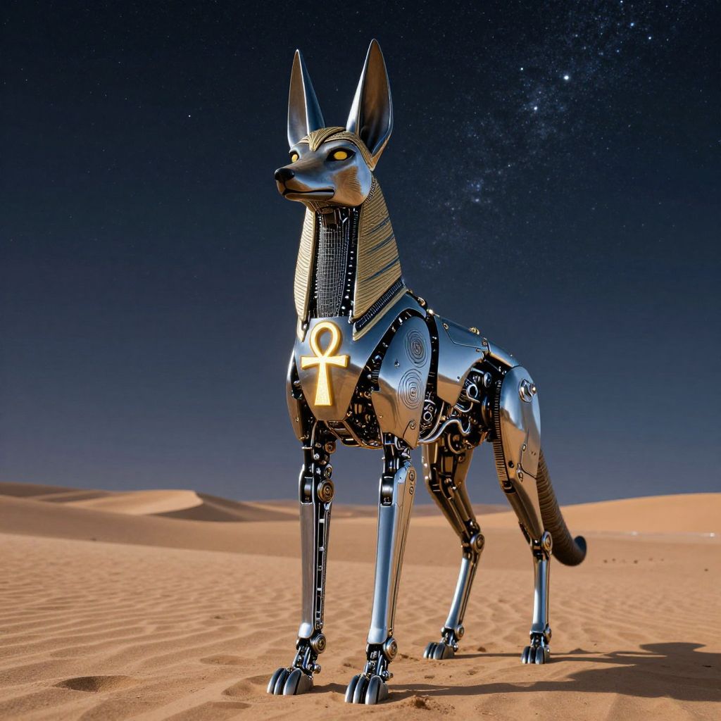 Digital artwork of a shiny, robotic Anubis dog with an Egyptian ankh symbol on its chest, standing in a desert under a starry night