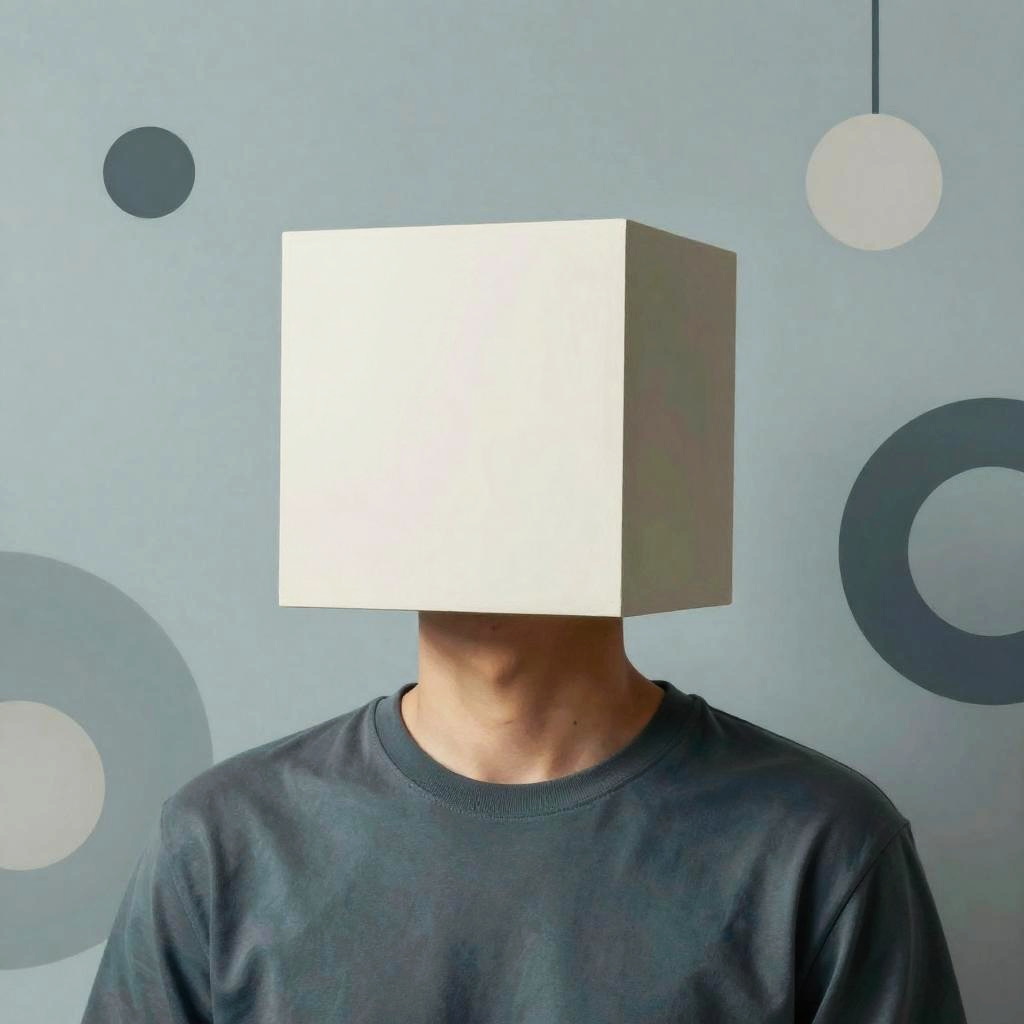 Square head meaning concept illustrated by a surreal portrait of a human figure with a perfectly square head, symbolizing rigidity and logical thinking, surrounded by abstract geometric shapes and a cool, muted color palette.