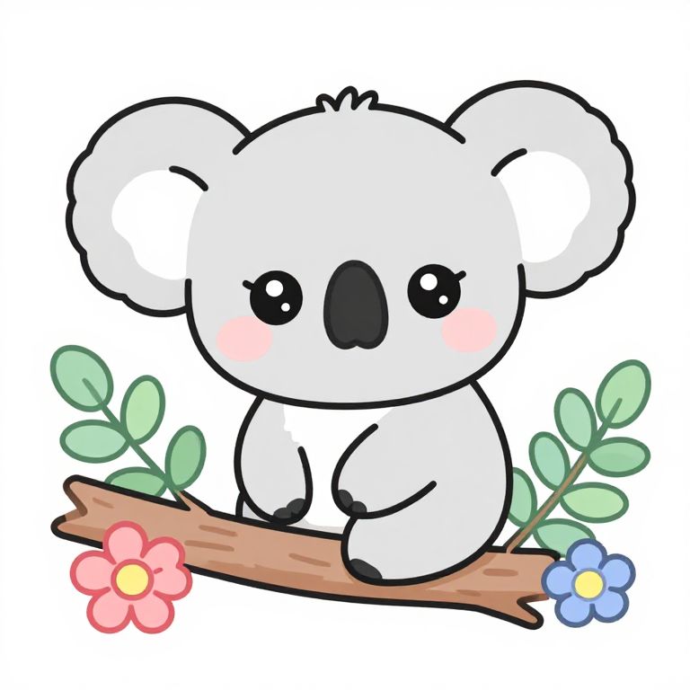 Cute kawaii baby koala perched on a eucalyptus branch, big sparkling eyes, soft pastel colors, surrounded by colorful flowers, adorable and simple outlines, perfect for cute koala coloring pages, playful and heartwarming style