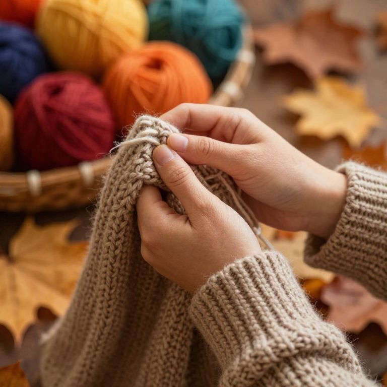 Close-up photograph of hands knitting a beige sweater, surrounded by colorful yarn balls and autumn leaves on a wooden surface.