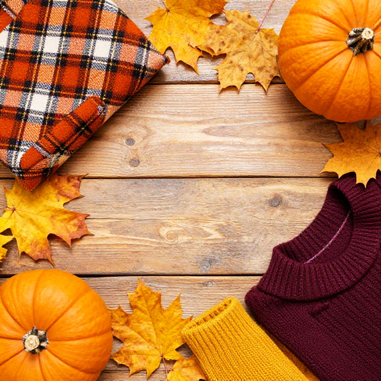 Butten attached to a thick knitted sweater, colorful yarn background, cozy autumn setting with falling leaves, warm orange and brown hues, soft focus, inviting and comforting atmosphere, hyper-realistic textile depiction