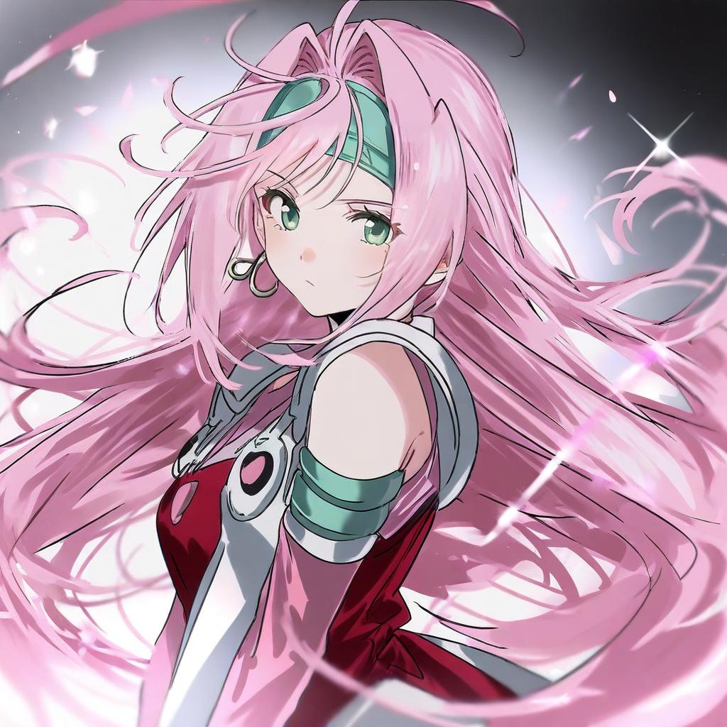 Mylene jenius, macross, 1girl, floating hair, green eyes, pink hair, long hair, very long hair, hair intakes, by artist aogisa, animagine