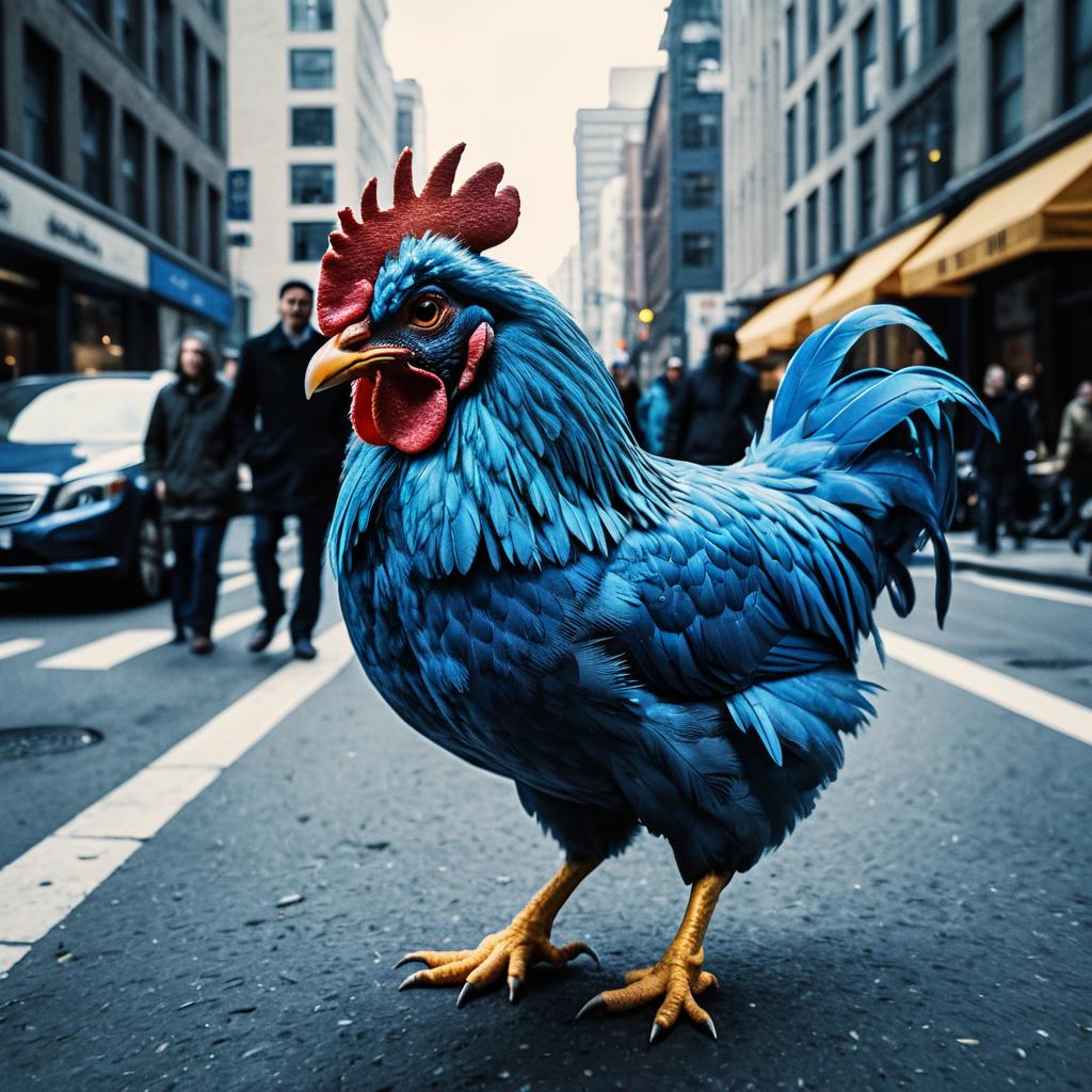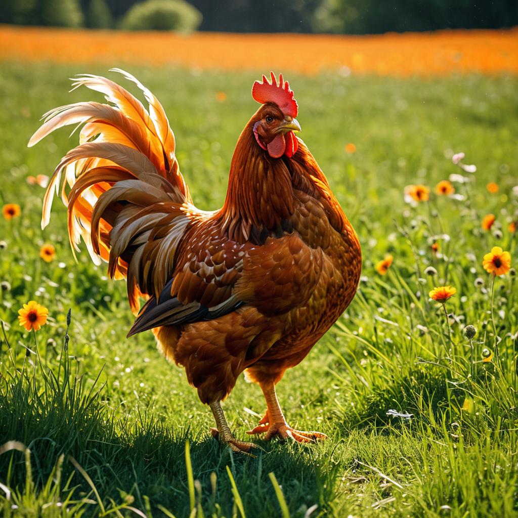 A vibrant orange cartoon chicken, styled after Winston Churchill, confidently strutting in a sunlit meadow.