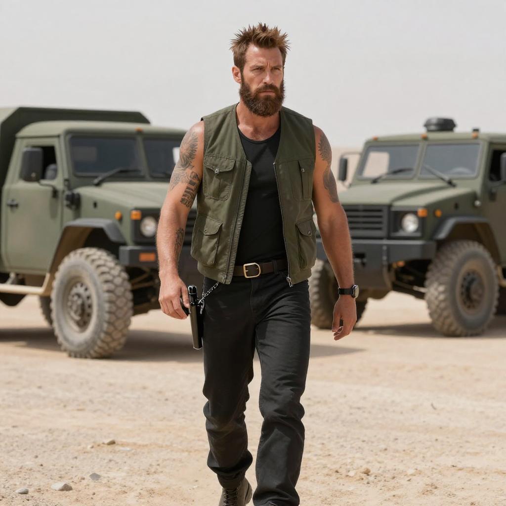 Photograph of a rugged, bearded man with spiky brown hair and tattoos on his arms, walking confidently in a desert-like setting. He's wearing a dark green sleeveless vest over a black shirt, black pants, and a black watch. In the background are two military-style, olive-green trucks with large tires. The man has a serious expression and a holstered gun on his right side. The ground is sandy and the sky is bright.