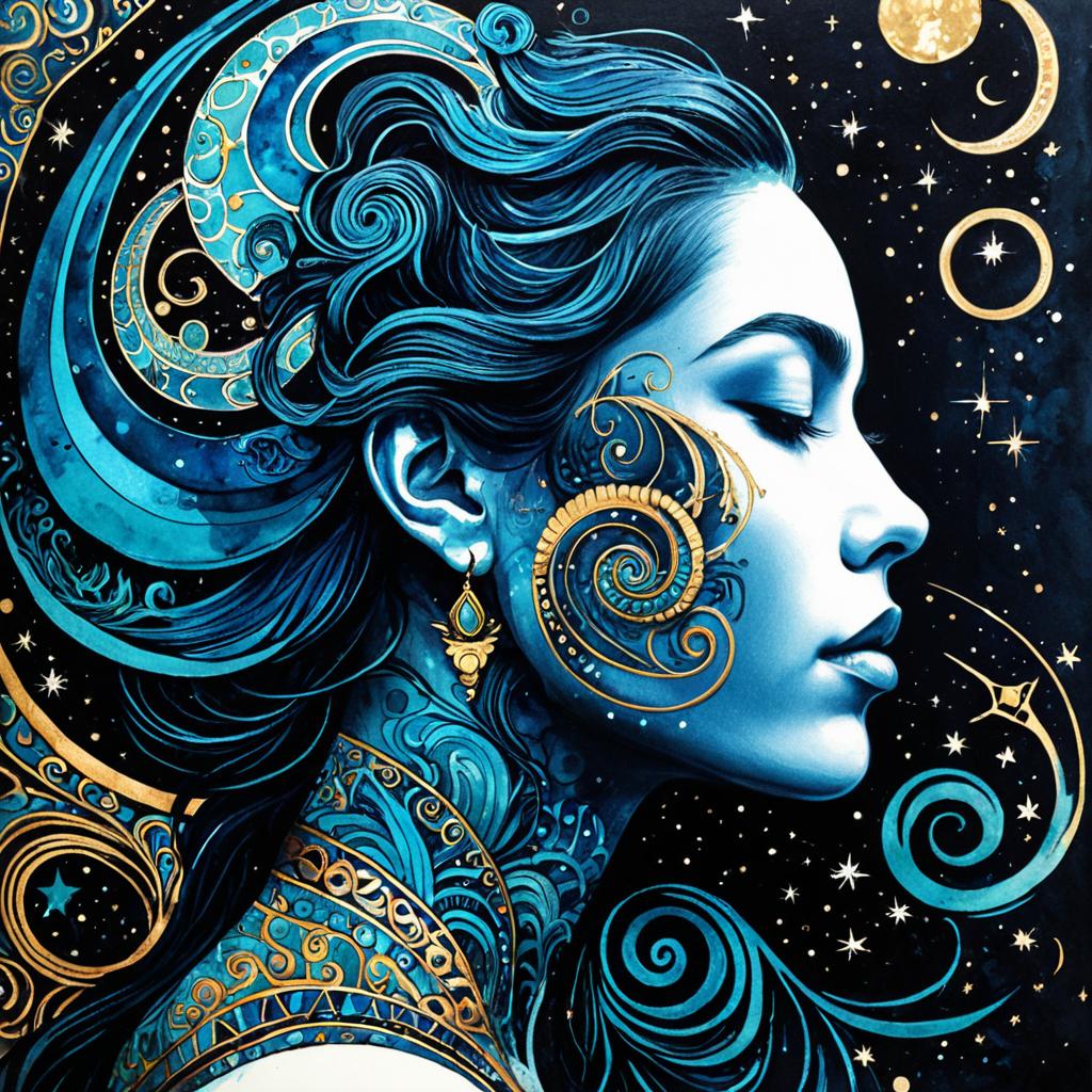 A vibrant, abstract portrait blending human features with celestial and oceanic elements, ink wash technique, swirls of indigo, turquoise, gold, and black come together to form a side profile of a face, the image exudes a psychedelic, dream-like quality with intricate patterns reminiscent of art nouveau intertwined with celestial motifs on a dark, textured background