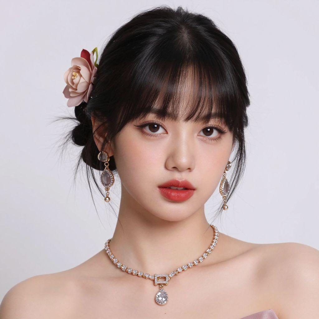 Photograph of an East Asian woman with fair skin and black hair styled in a low bun adorned with a pink flower. She has full, red lips and is wearing subtle makeup. Her dark eyes are accentuated with eyeliner. She has dangling, gold earrings with intricate designs and wears a delicate, pearl necklace with a large, oval pendant. Her bare shoulders suggest she may be wearing a strapless top. The background is plain white, making her the focal point. The image has a soft, slightly blurred texture, giving it a dreamy quality.