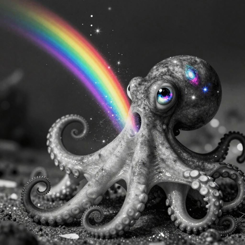 Realistic photo.a photograph (black and white or halftone) of an octopus with multimedia colorful galaxies and stars in curious eyes who is vomiting pure rainbows and stardust sparkles. She wretches as a beautiful spectrum of colorful light and sparklies made of glitter spills from her open mouth with force lighting up the room realistic photo