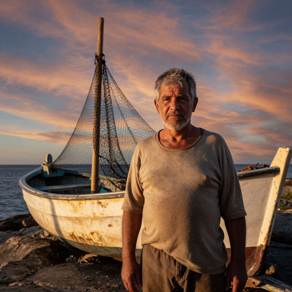 Photograph of an older man with short gray hair and a beard, wearing a slightly dirty, light gray t-shirt and dark pants, standing in front of a weathered white fishing boat with a black net on its mast. The boat is positioned on a rocky shoreline at sunset, with vibrant orange and pink clouds in the sky and the calm sea in the background. The man's tanned skin and rugged appearance suggest a life of hard work. The lighting casts a warm, golden glow on the scene, highlighting the textures of the boat and the man's weathered face.