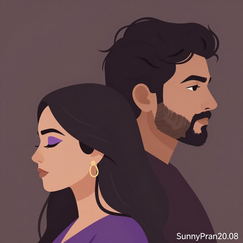 Digital illustration of two people in profile. Female in foreground with dark hair, purple eyeshadow, earring, closed eyes, wearing purple top. Male in background with dark, wavy hair, beard, neutral expression. Both have white outlines. Background in gradient brown tones. Artist's "SunnyPran20.08" in bottom right corner.