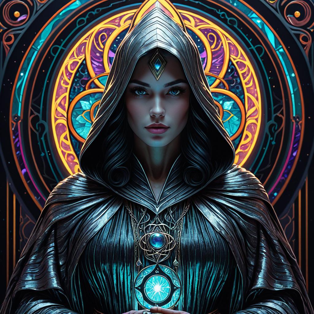 Front portrait of a dark witch wearing a detailed silver robe with a hood. She has striking shimmering eyes and holds a glowing amulet with a cosmic design. The background features a colorful, swirling Art Nouveau tarot-inspired pattern with glowing and gaudy colors, giving a mystical and luminescent atmosphere.