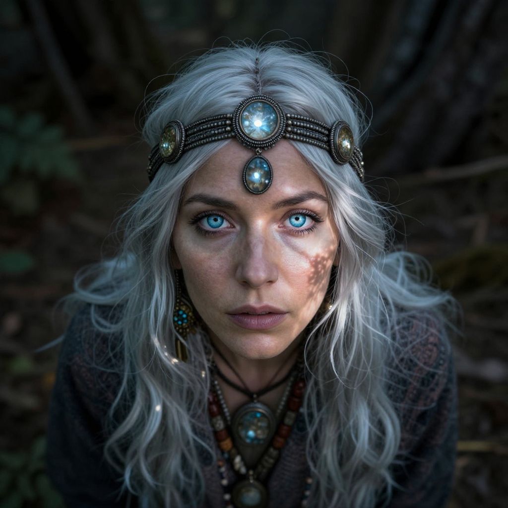 Photograph of a young woman with striking blue eyes and long, wavy silver hair, wearing a dark, intricate headpiece with five large, glowing blue gemstones. She has a fair complexion with a slight freckle on her right cheek. Her dark, woolen cloak contrasts with the dark, blurred forest background. She wears a necklace with a matching blue gemstone, and her intense, focused gaze is directed at the camera. The lighting emphasizes her eyes and the gemstones, creating a mystical, otherworldly effect. The overall mood is mysterious and enchanting.