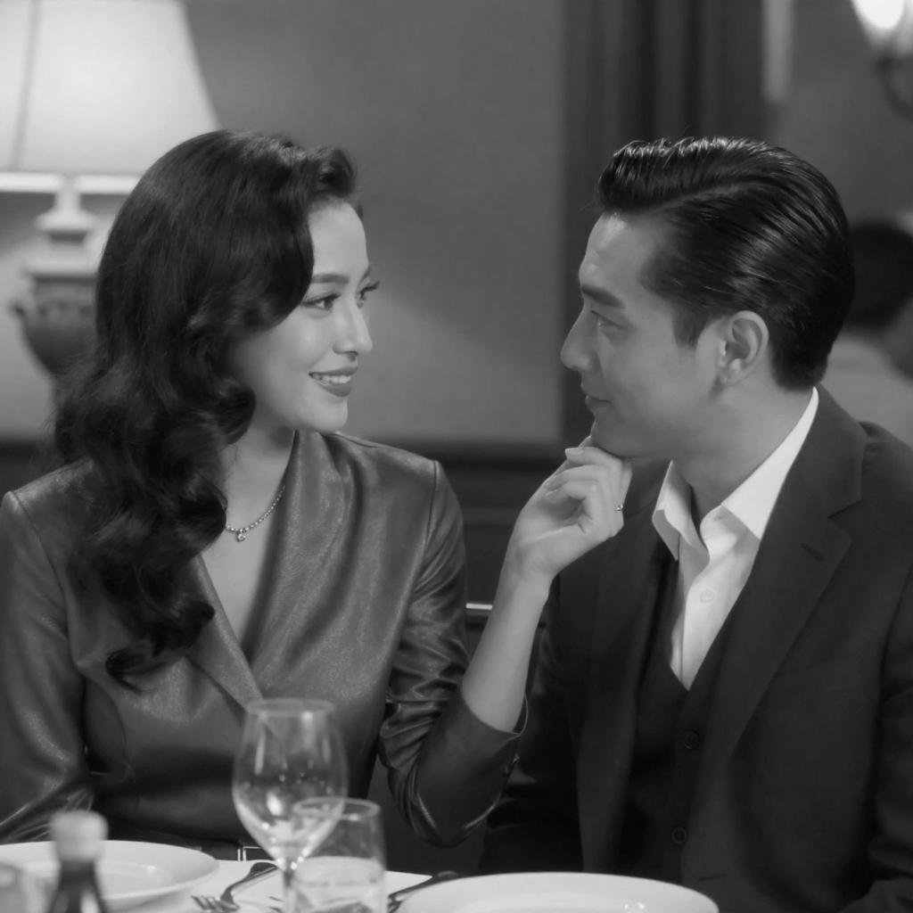 Photograph of a man and woman in close-up, facing each other, smiling. Man has dark hair, mustache, black suit. Woman has dark hair, pearl earrings, black dress with pearl detail. Warm lighting, soft focus, intimate moment. Both have intense, joyful expressions.