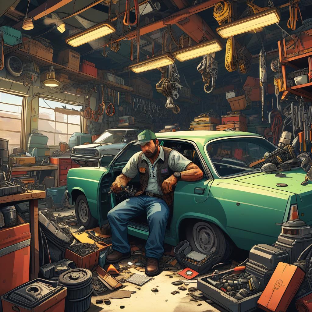 Grand Theft Auto inspired illustration of a resourceful mechanic, working inside a cluttered auto shop.