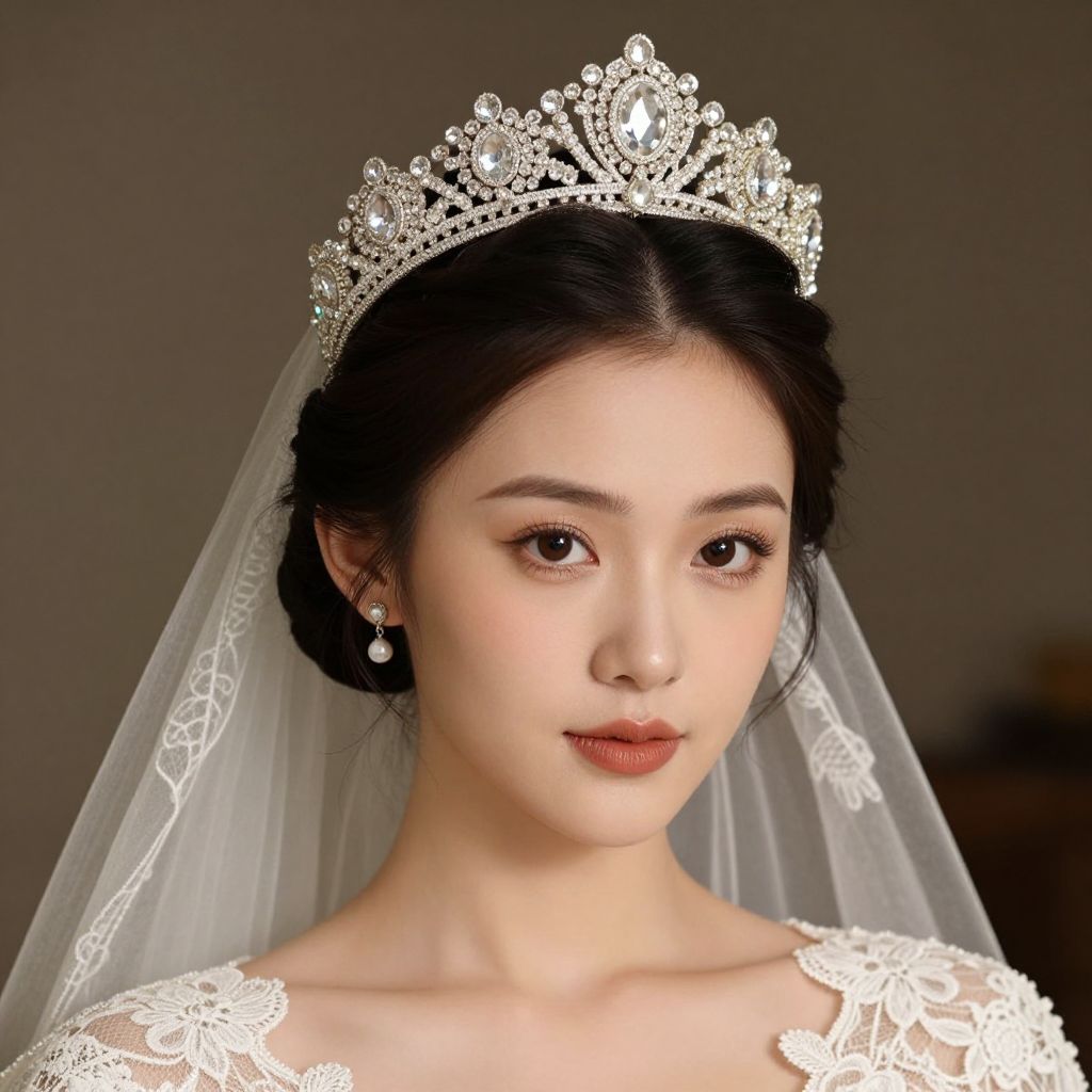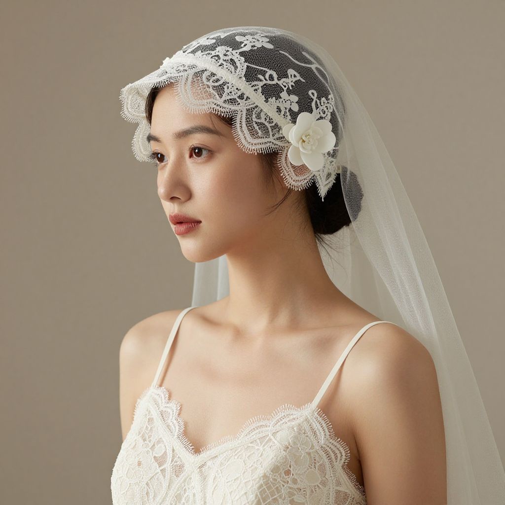 Photograph of an Asian woman in profile, wearing a white lace wedding dress and a pink floral tiara, with dark hair in an elegant bun,