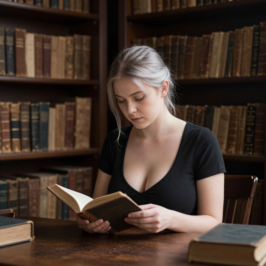 An elegant library archivist woman with delicate features, fair skin, and silver-streaked hair tucked behind her ears, seated at a low wooden table surrounded by towering shelves of old, dusty books. She is reading a rare 19th-century novel with a focused expression, the pages slightly yellowed, and the atmosphere is quiet and hushed, with dust motes floating in the afternoon light. The setting emphasizes the timeless, intimate charm of the library's vintage books.. The woman has big tits and cute face