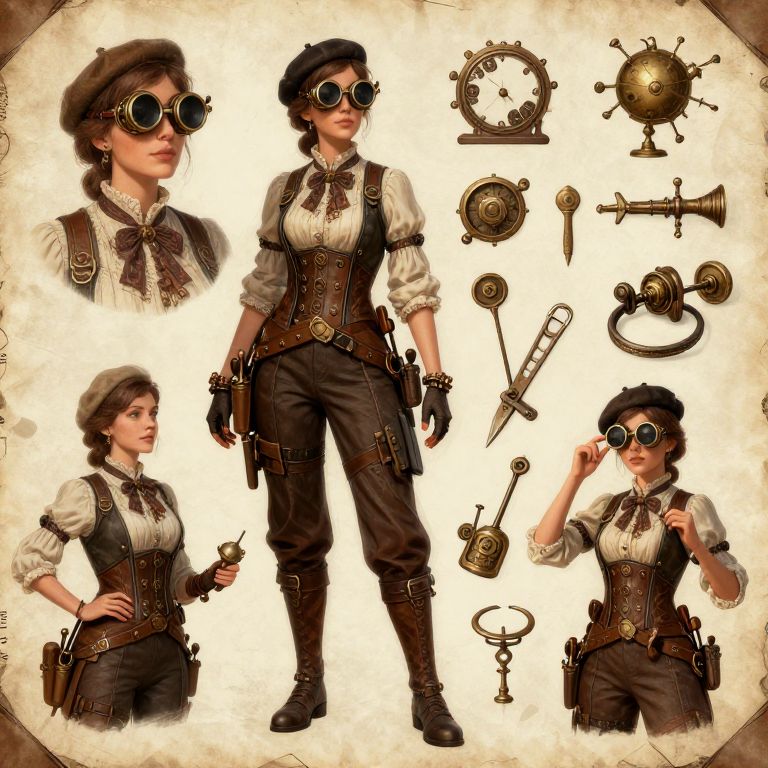 Female character reference sheet illustrating a steampunk engineer, adorned in Victorian-inspired attire with mechanical goggles, detailed tools and inventions, diverse poses highlighting her resourcefulness, alongside a warm color palette and handcrafted textures.