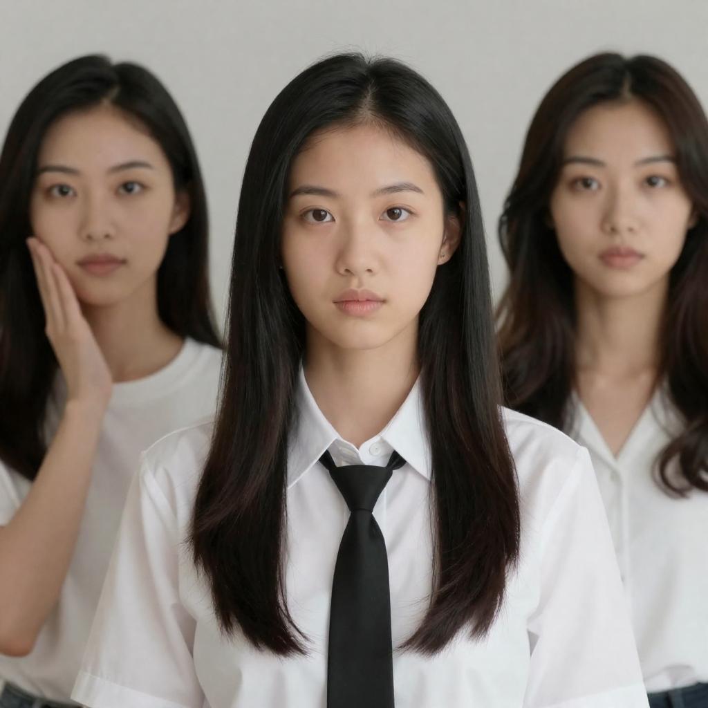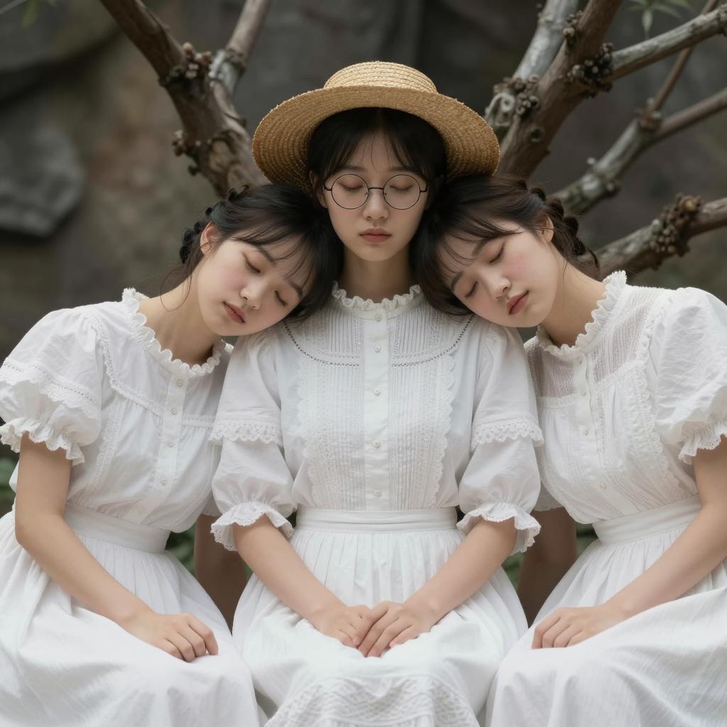 Five young Asian women standing indoors by a large window with white curtains. They wear light, floral and pastel-colored summer dresses. The room has soft natural light and a calm atmosphere. Most women have long straight hair, dressed in casual, elegant styles.