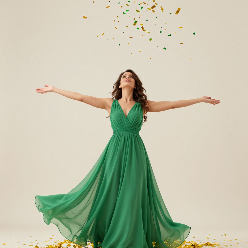 A woman in a flowing green dress stands against a soft, ethereal backdrop, her arms outstretched as a cascade of golden and green confetti bursts around her, evoking a sense of freedom and celebration in this high-definition, digitally rendered scene.