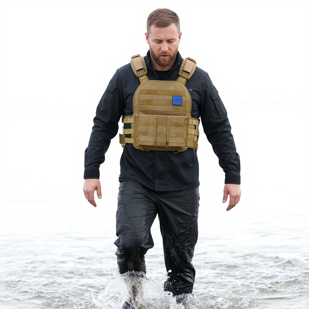 Photograph of a bearded man with short brown hair walking through shallow water. He's wearing a black long-sleeve shirt and black pants, with a tan tactical vest over it. The vest has multiple pockets and a small blue patch on the chest. The water splashes around his legs, and the background is a bright white, making him the clear focus.
