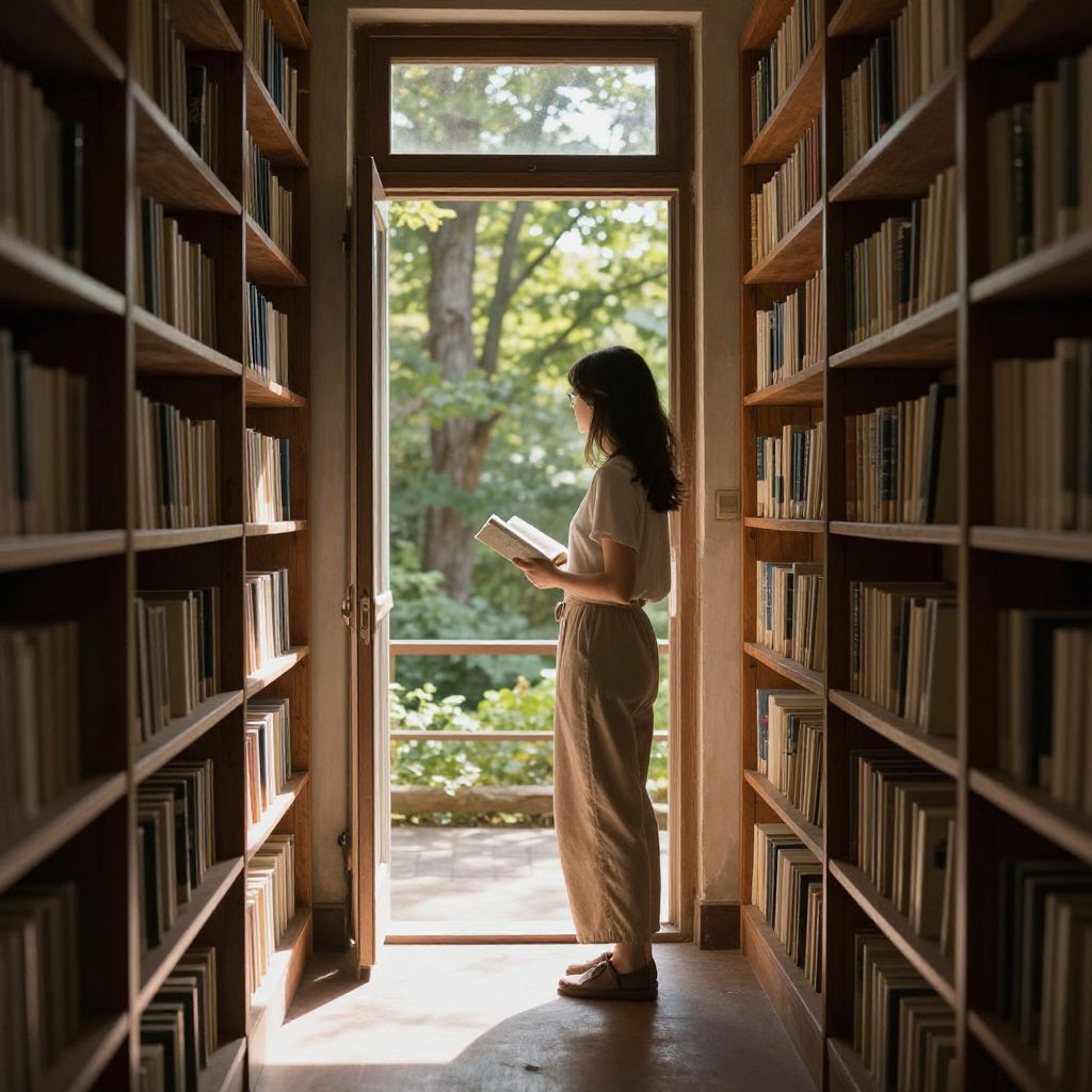 Photograph of a woman with long dark hair, white shirt, and beige pants, standing in a sunlit library doorway, reading a book, surrounded