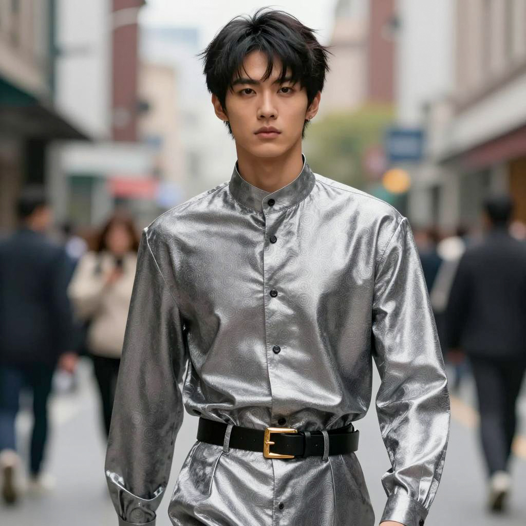 Five men with dark hair and neutral expressions wearing colorful, ornate suits stand in front of a brightly lit amusement park sign with neon lights and star decorations. The central man wears a black and white suit with gold embellishments, while the others wear blue, white, red, and yellow suits. All wear large sunglasses and belts with large gold buckles. The background features a sign with Chinese characters illuminated with light bulbs.
