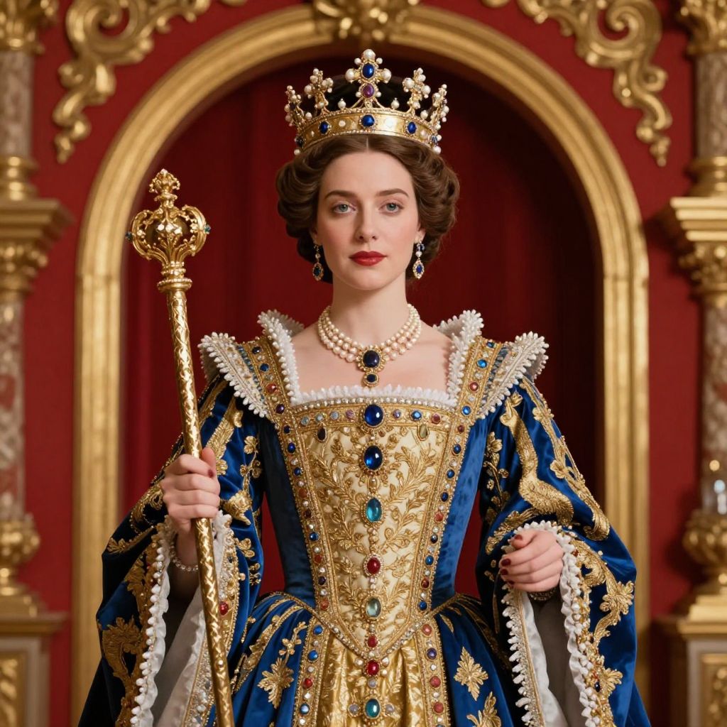 Portrait of a regal queen dressed in elaborate Renaissance-style royal attire. She wears a rich blue and gold gown adorned with intricate embroidery and glittering jewels. A majestic crown with pearls and gemstones sits atop her head, and she holds an ornate scepter. The background features a luxurious red and gold arch framing the figure, enhancing the majestic and historical atmosphere.