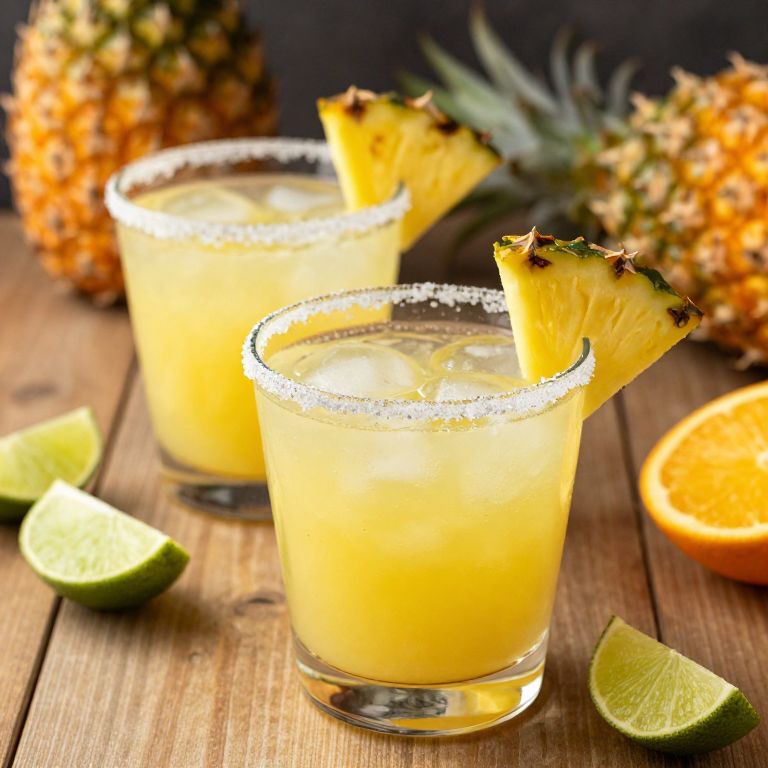 Photograph of two margaritas with salt rims, pineapple wedge garnishes, lime wedges, and whole pineapples on a wooden surface.