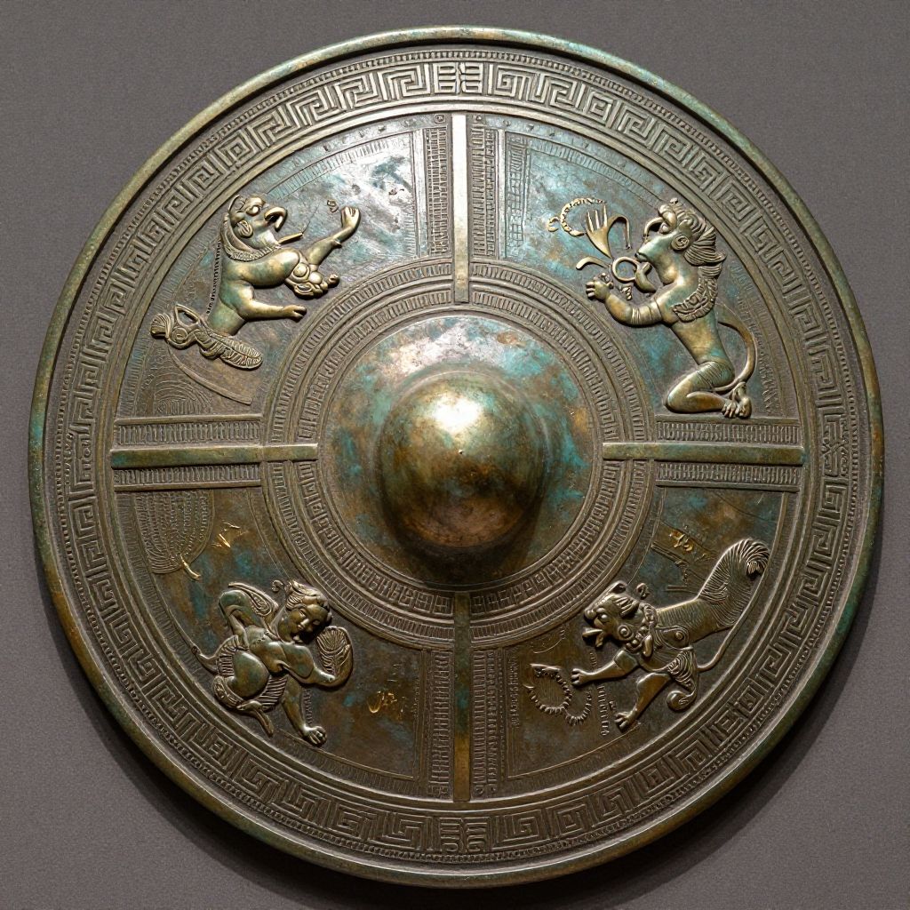 Ancient Greek shield designs richly detailed, featuring mythological creatures and intricate geometric patterns, bronze textures reflecting sunlight, classical art style