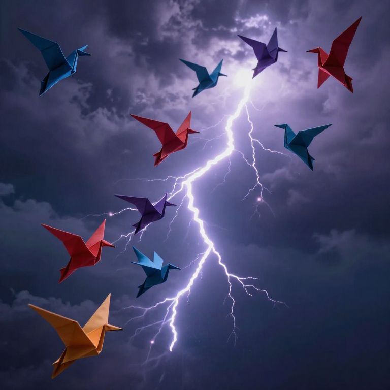 Photograph-style digital illustration depicting a dramatic sky with dark, stormy clouds illuminated by a bright, jagged bolt of lightning. Ten origami-style birds, each colored in different shades of red, blue, and yellow, are mid-flight around the lightning bolt. The birds' crisp, angular shapes contrast with the dynamic, chaotic lightning. The overall color palette includes deep purples, blues, and whites, enhancing the stormy atmosphere. The birds are scattered across the image, creating a sense of movement and energy against the tumultuous sky.