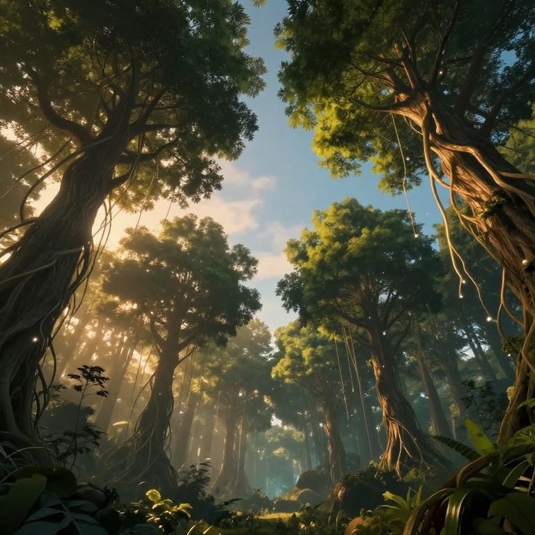A surreal forest where a colossal tree defies gravity, its roots sprawling upward into the clouds while its branches descend toward the earth, cradled by a serene landscape of floating birds and evergreen pines.