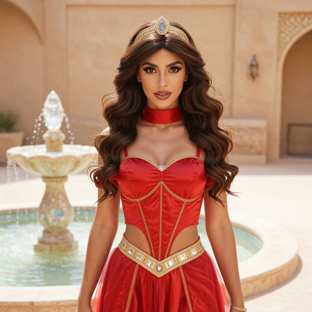 Photorealistic portrait of Princess Jasmine wearing a luxurious red dress costume with a corseted waist and high neck, standing in a vibrant, enchanted desert courtyard with sandstone walls and a crystal fountain, her deep brown eyes sparkling with confidence, long wavy brown hair flowing behind her, and a subtle golden crown resting on her head.
