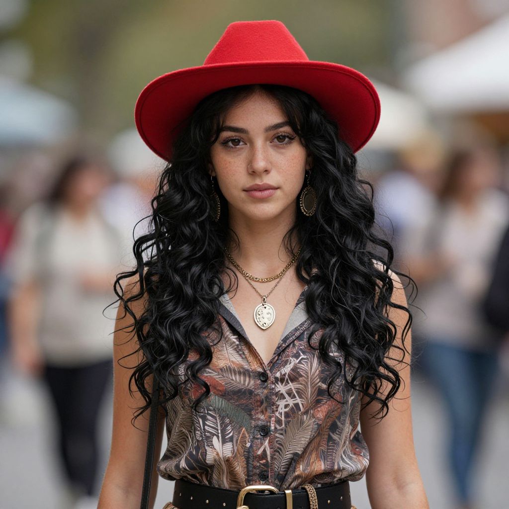 Photograph of a young woman with long, wavy black hair wearing a bright red wide-brimmed hat. She has olive skin, brown eyes, and a slight smile. She is dressed in a sleeveless, patterned blouse with earthy tones and a black belt with a gold buckle. She wears a silver necklace with a circular pendant. The blurred background shows a busy street with indistinct people and buildings, suggesting an urban setting. The photograph has a sharp focus on the woman, highlighting her confident, stylish appearance.