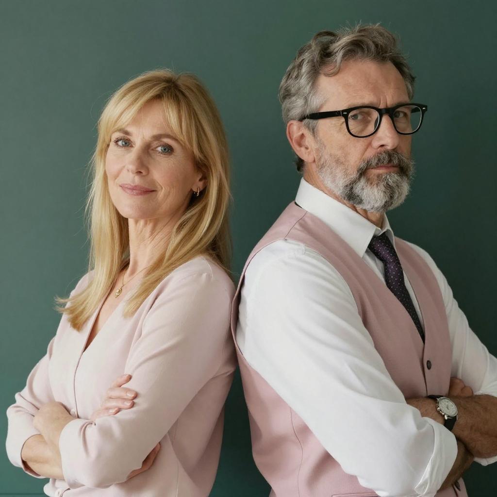 Photograph of a middle-aged couple standing back-to-back against a green wall. The woman has long blonde hair, bangs, and a light pink top, smiling softly. The man has a gray beard, black-rimmed glasses, and a white shirt with a pink vest and patterned tie, looking slightly serious. Both have arms crossed, creating a relaxed yet slightly formal vibe.