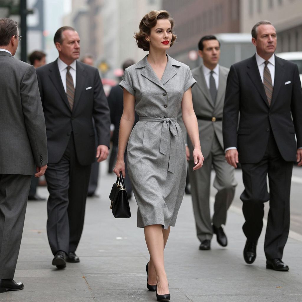 Elegant woman in a 1950s \"New Look\" dress strides confidently down a bustling city street, surrounded by formally dressed men in suits, capturing the transformative era where fashion became an art form emphasizing structured silhouettes and feminine elegance.