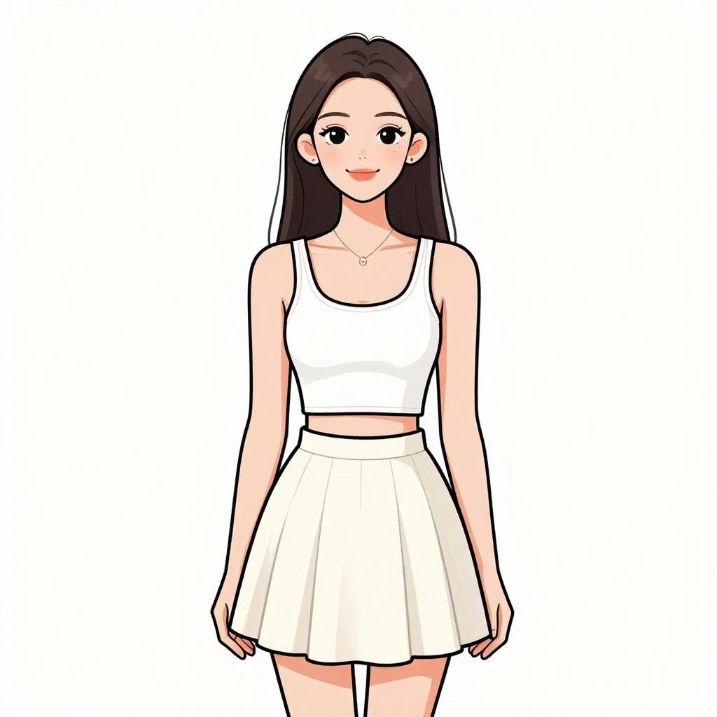 Woman with pretty face and pretty hair. smiling Woman, minimalist, white cropped tank top with thin straps, scoop neckline, ribbed texture, paired with a high-waisted pleated skirt in a subtle A-line silhouette, short hemline, soft white fabric with a hint of translucency, small pendant necklace, simple stud earrings, straight hair with a center part, plain white studio background. --sref 1467