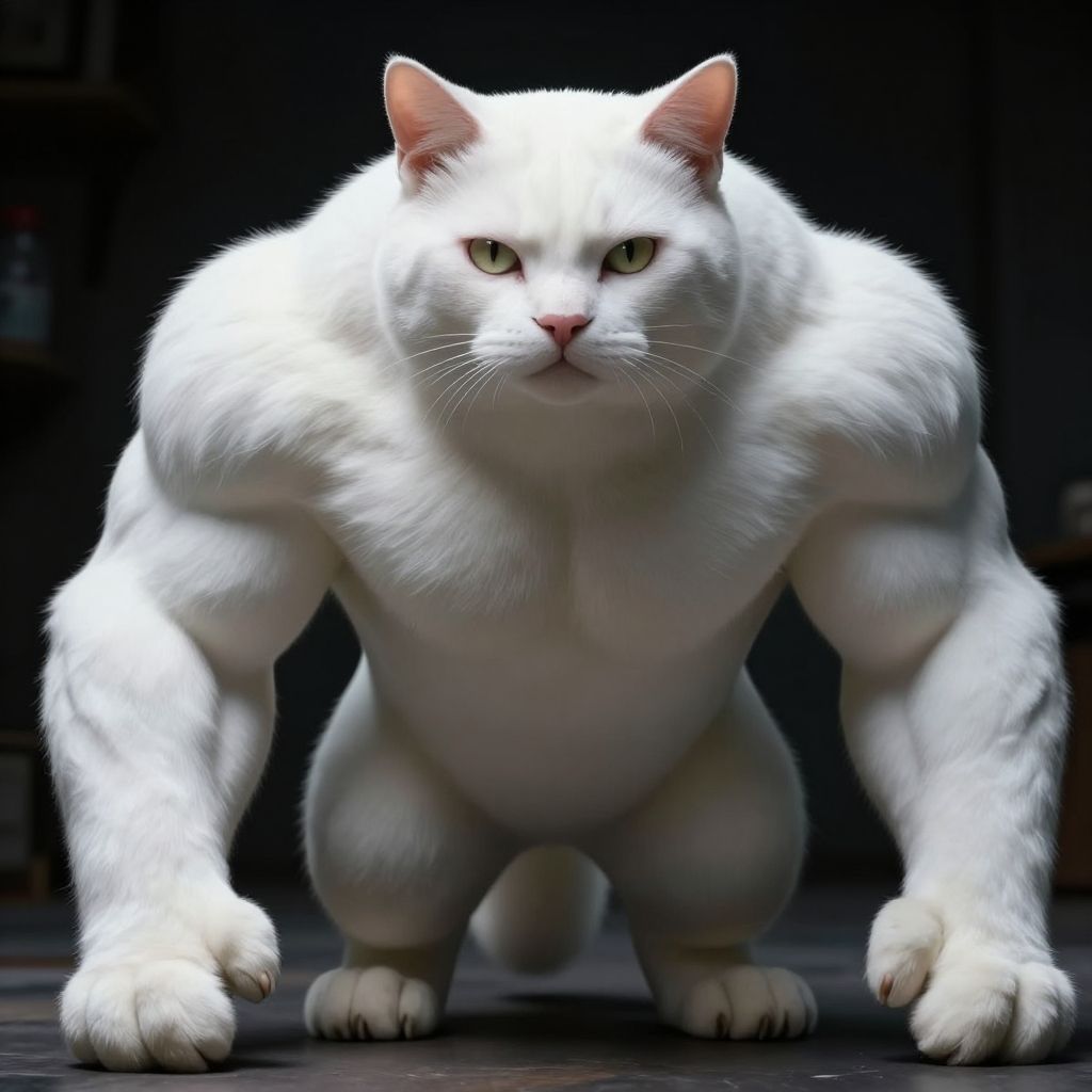 Anthro muscular, maddog cyber, a huge giant white reptilian albinos HuMeow, ultrarealistic, ultradetails, 8k, no text, natural light, dark atmosphere
