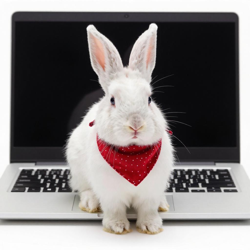 Photograph of a white bunny with red bandana, sitting in front of a laptop. The bunny's reflection is visible on the laptop screen. The image is brightly lit with a white background, creating a clean, minimalistic look. The camera angle is slightly above eye level, focusing on the bunny and laptop, with a shallow depth of field that keeps the background blurred.