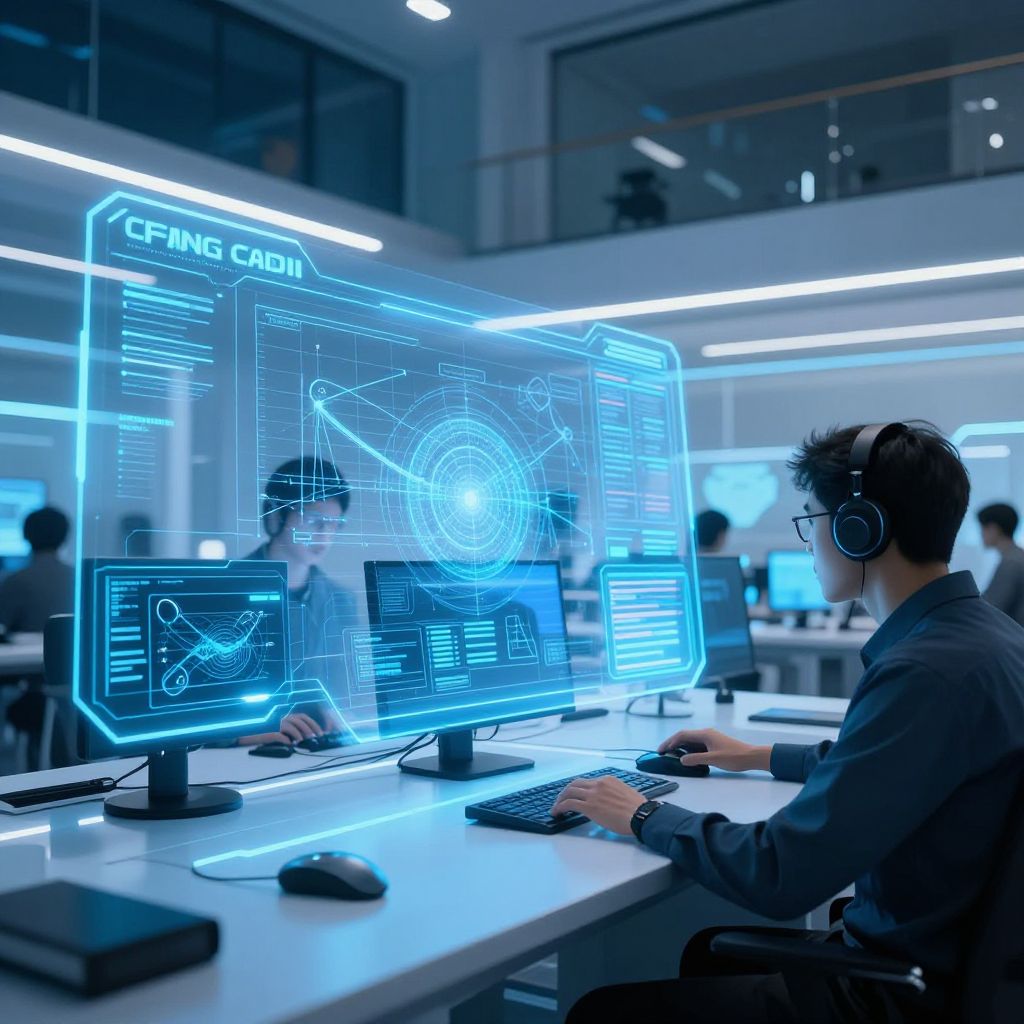 AI CAD futuristic design studio showcasing advanced artificial intelligence tools in computer-aided design, sleek holographic interfaces, engineers collaborating with transparent screens, neon blue and white light accents, ultra-modern architecture background