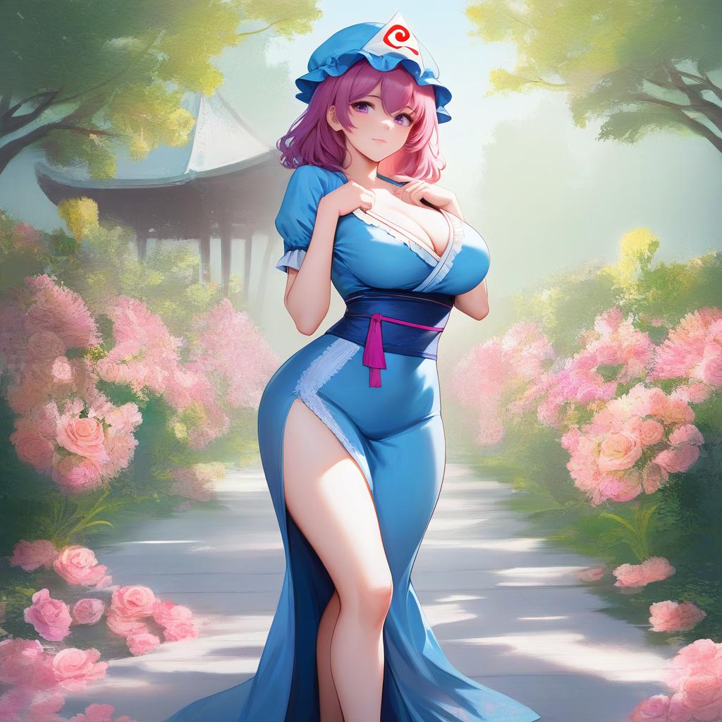 Saigyouji yuyuko, touhou, 1girl, pink eyes, pink hair, short hair, large breasts, blue kimono, hat, mob cap, triangular headpiece, realistic style, character, dark hair, long hair, purple eyes, curvy anatomy, confident pose, digital art style, summer vibe, silk red yukata, bamboo forest, warm golden hour light, misty mountain background