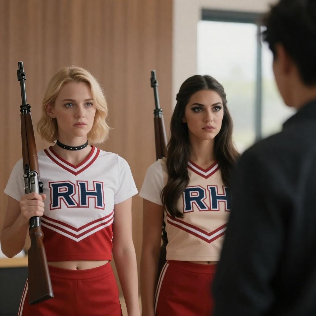 Photograph of three people indoors. Two women in cheerleader outfits with "RH" on shirts, holding a rifle. One blonde woman with short hair, choker, and red and white cheerleader top, looks serious. One brunette woman with long hair, smoky eye makeup, and beige cheerleader top, looks intense. One man with short dark hair, facing them, in a dark shirt, partially visible. Wood-paneled wall background, window on right.