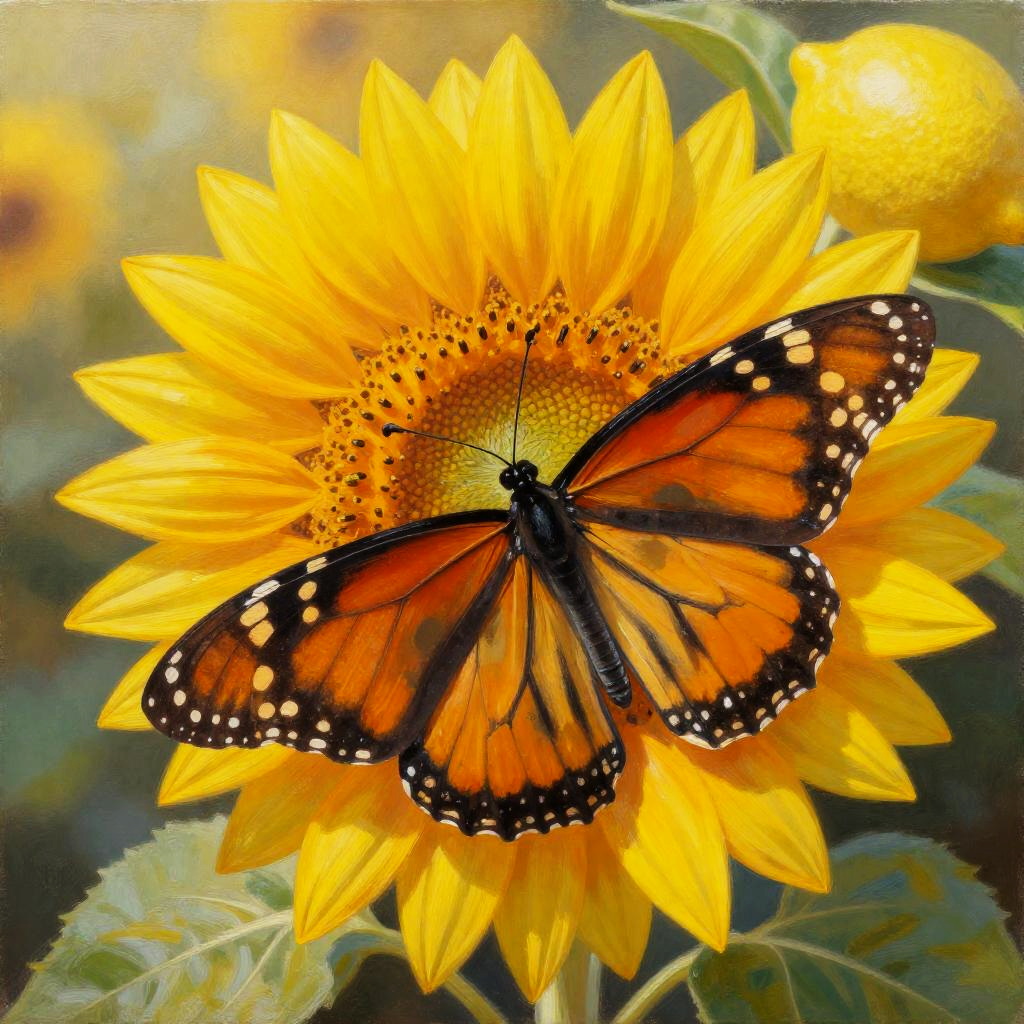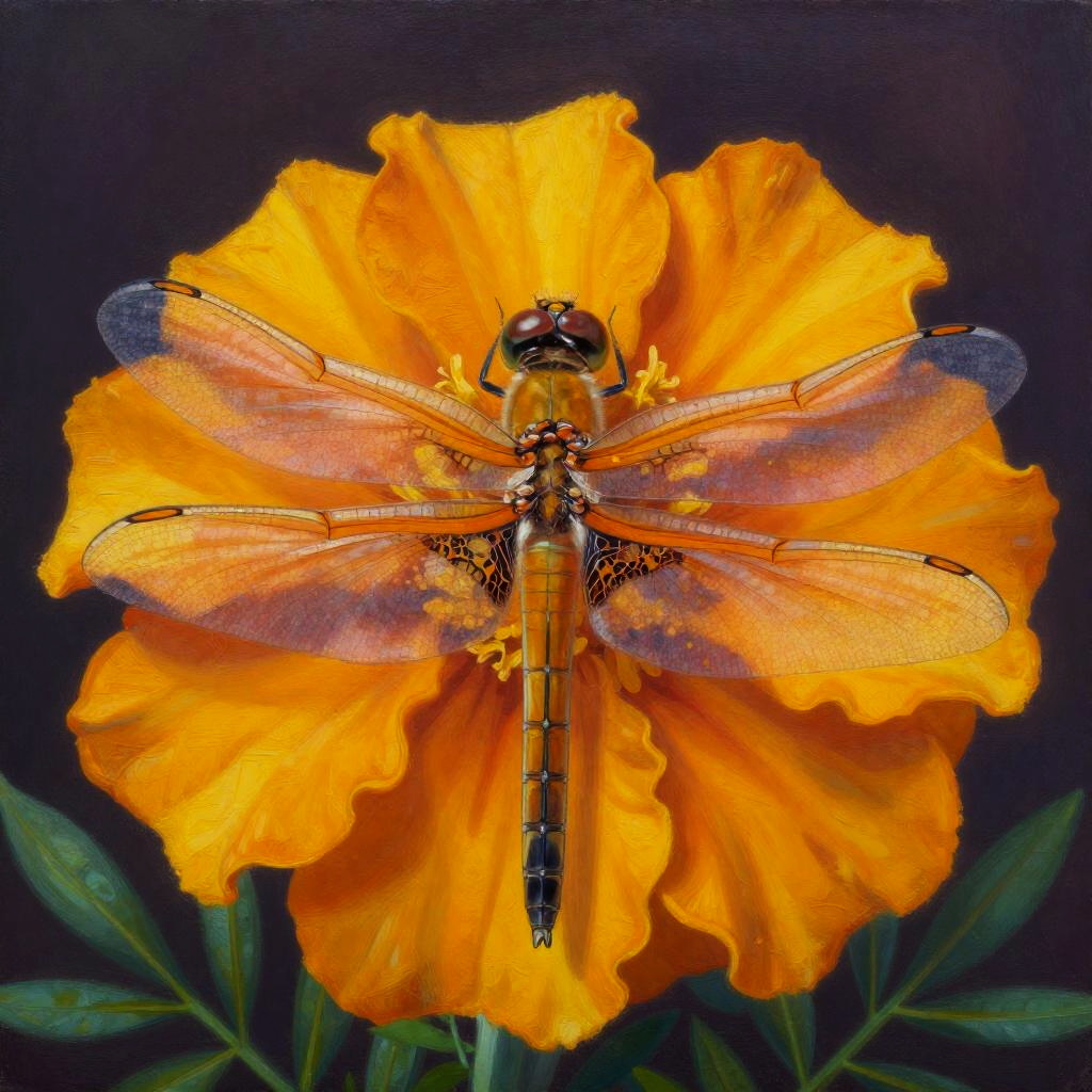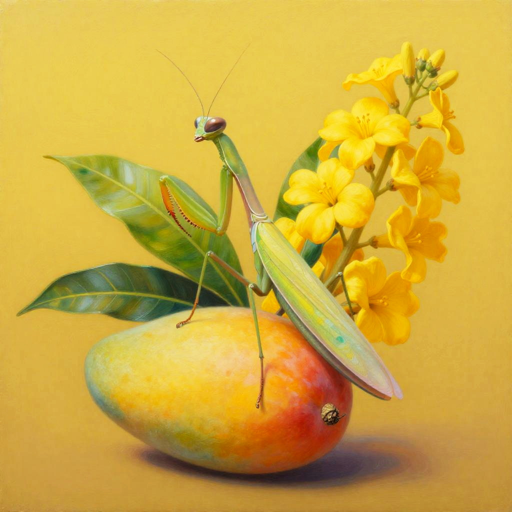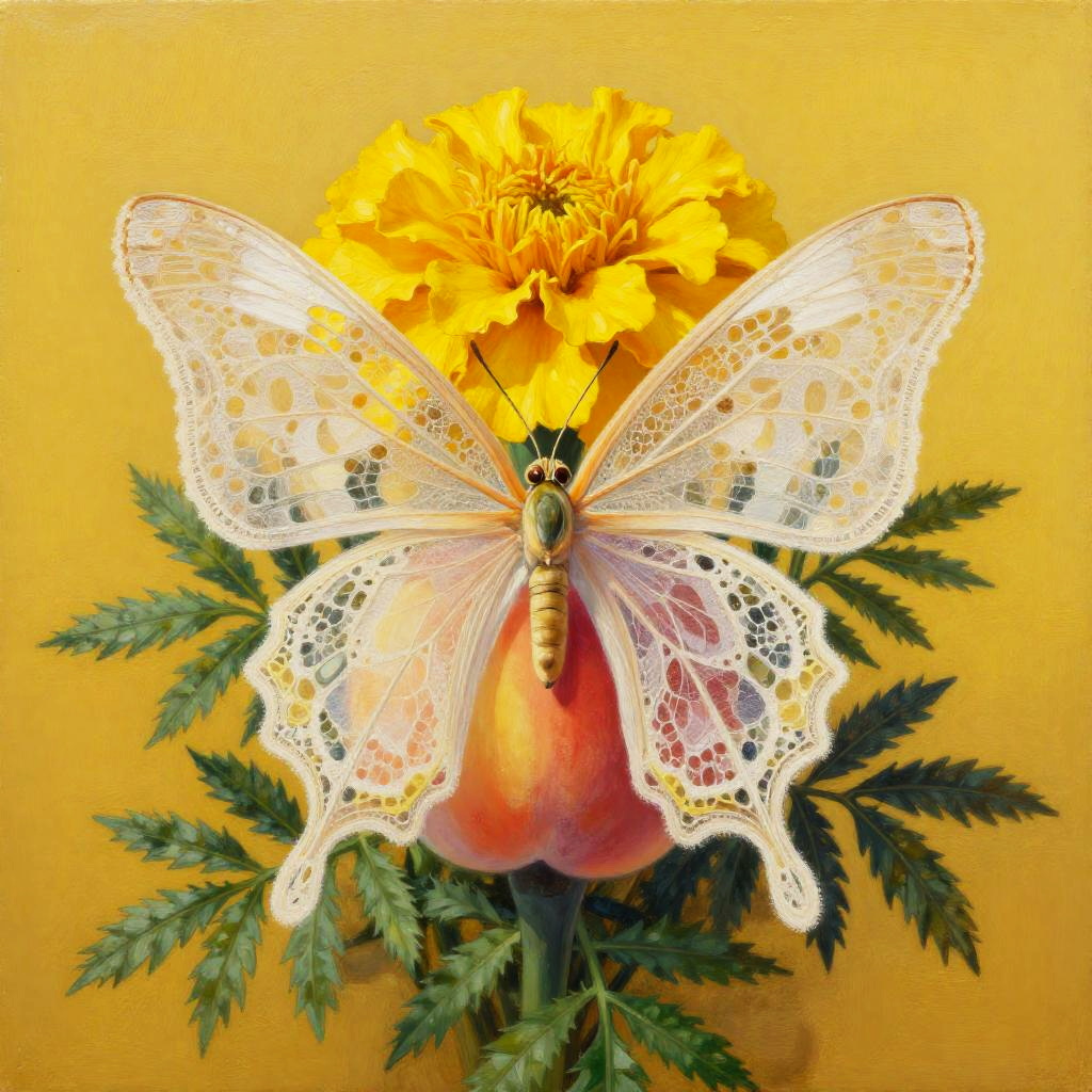 Full body, solo, lacewing, yellow marigold, ripe peach, insect wings, vibrant foliage, intricate patterns, delicate anatomy, bright colors, detailed textures, harmonious composition, soft lighting, yellow theme, realistic, painting (medium), acrylic paint (medium), mustard-yellow backdrop