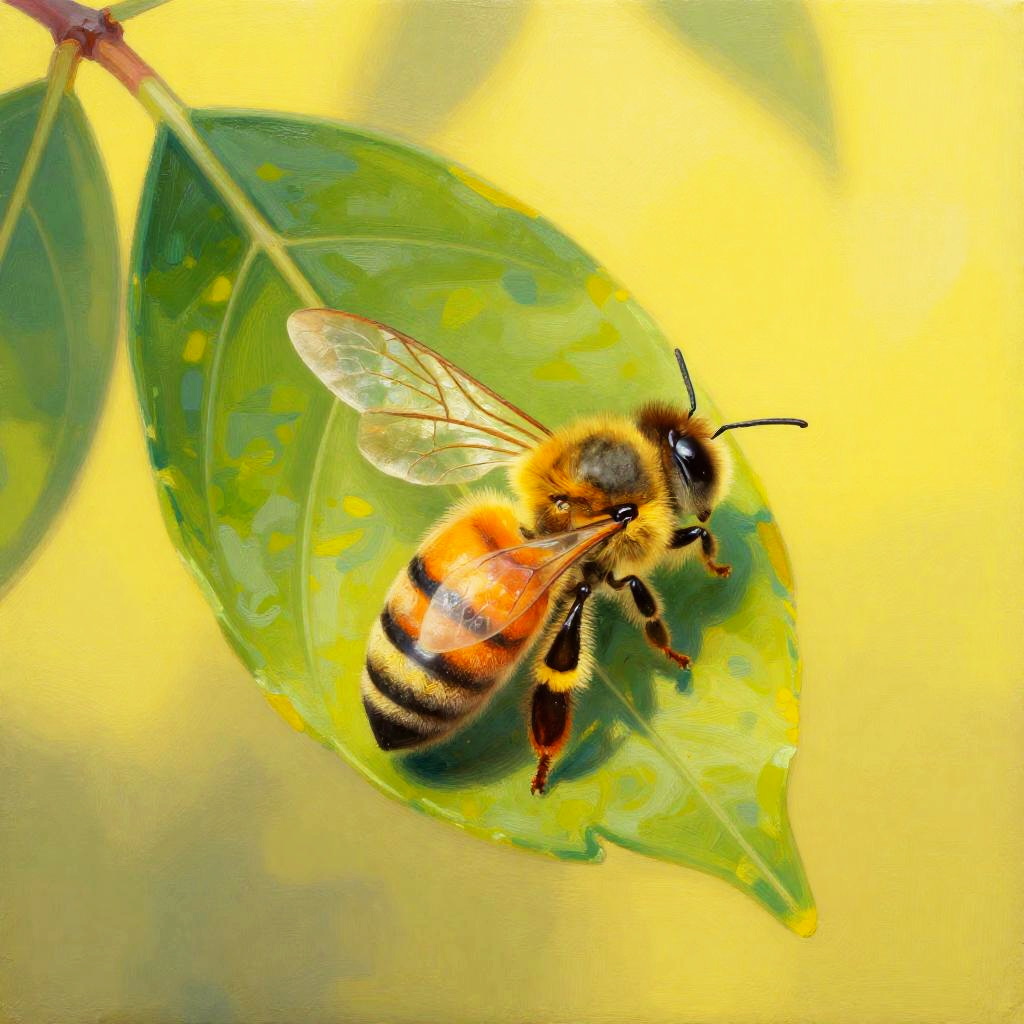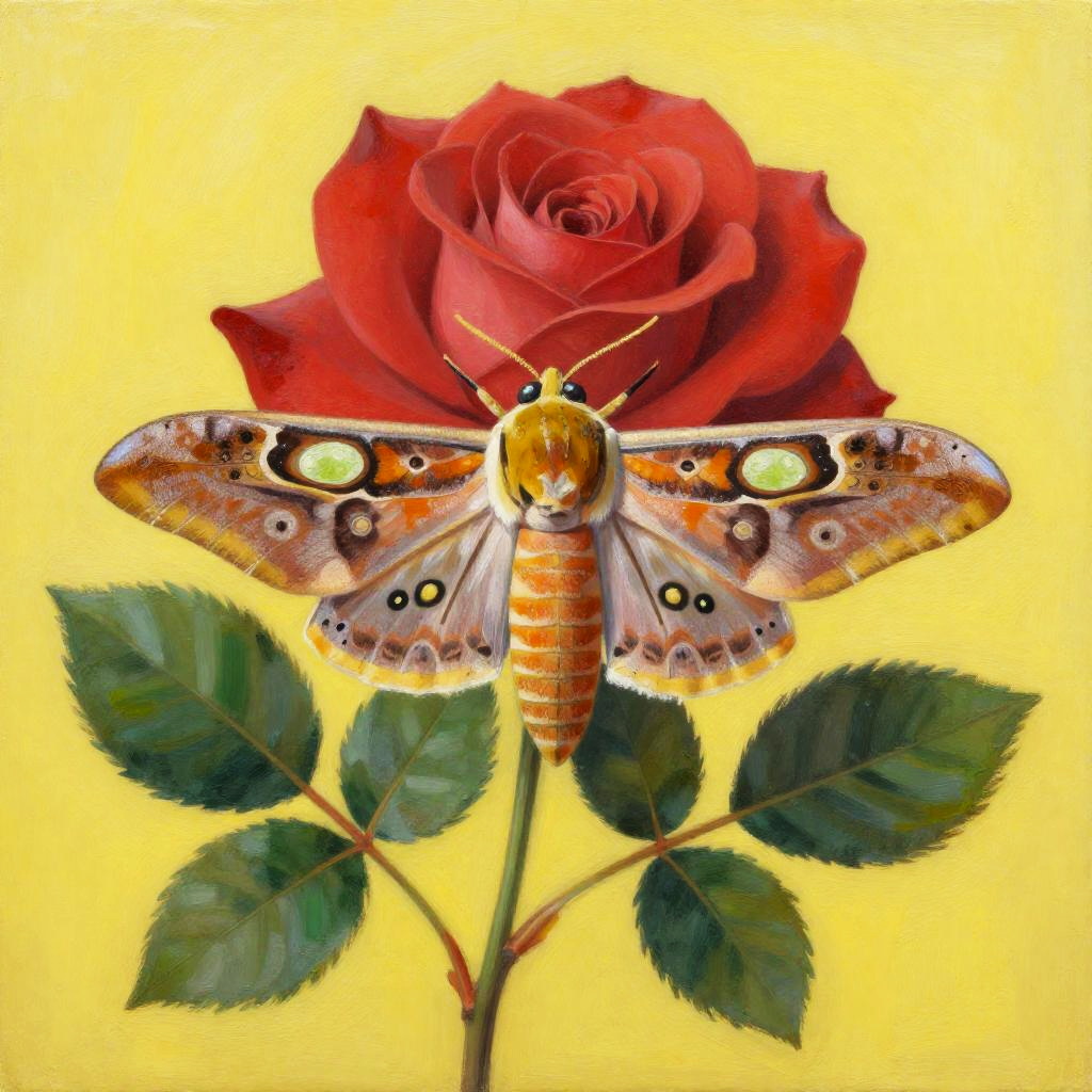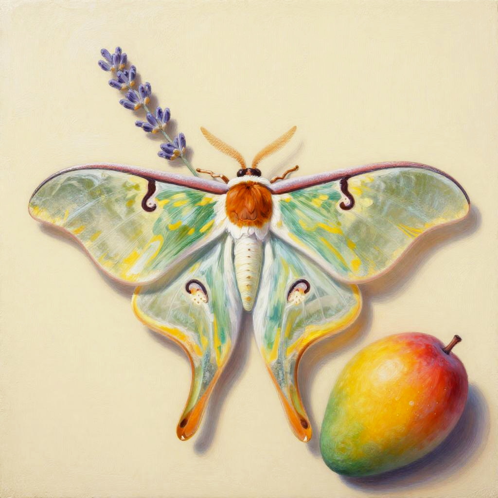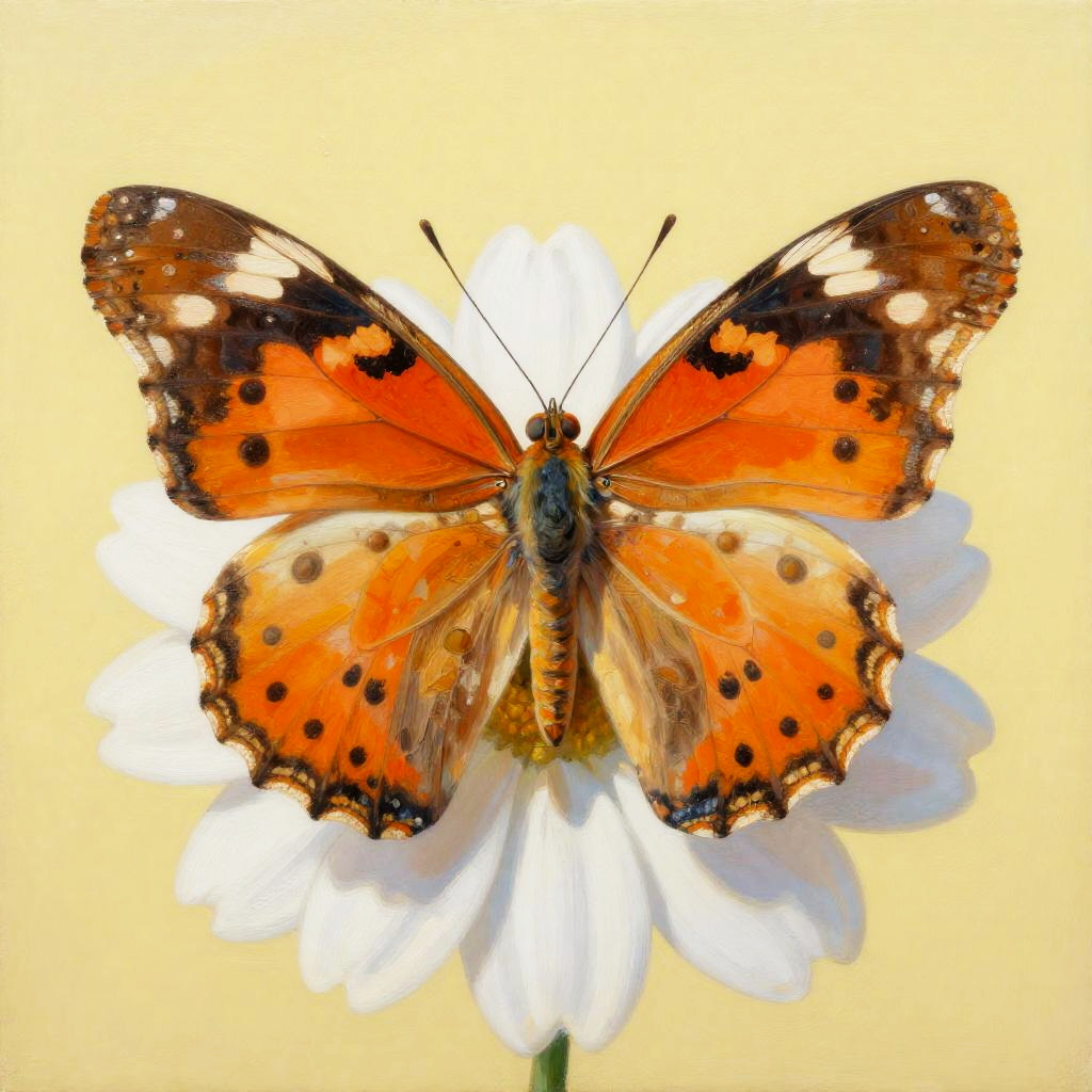 Full body, solo, lacewing, yellow marigold, ripe peach, insect wings, vibrant foliage, intricate patterns, delicate anatomy, bright colors, detailed textures, harmonious composition, soft lighting, yellow theme, realistic, painting (medium), acrylic paint (medium), mustard-yellow backdrop