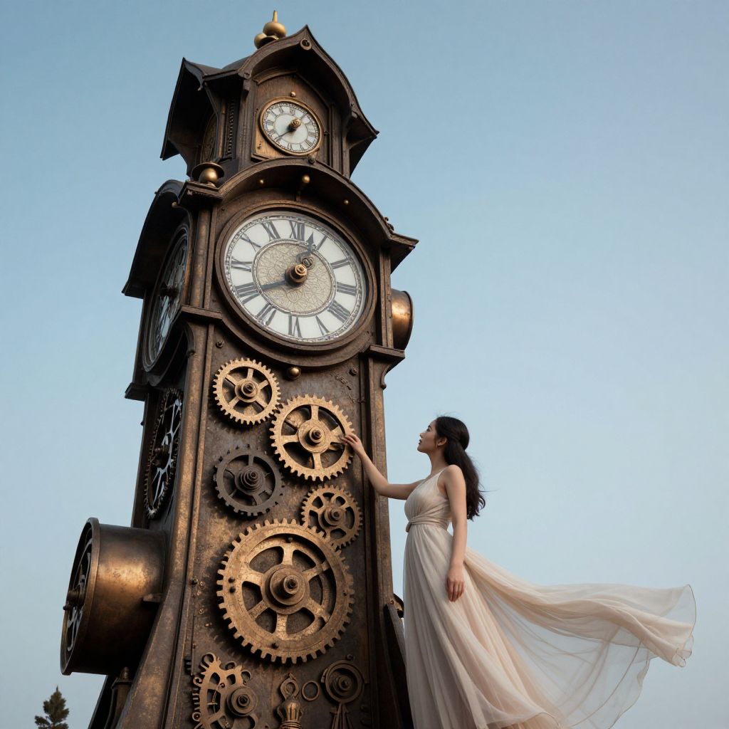 A woman in a flowing dress stands beside a towering, steampunk-inspired clock tower, her hand delicately adjusting its exposed gears as if controlling the passage of time itself.