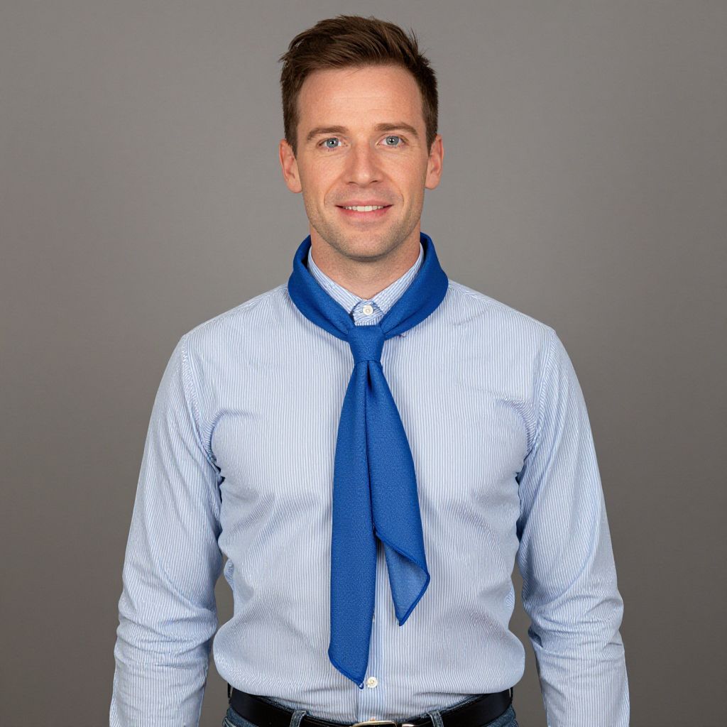 Photograph of a Caucasian man in his 30s with short brown hair and blue eyes, smiling slightly. He wears a light blue, long-sleeve, striped dress shirt with vertical lines and a bright blue necktie loosely knotted around his neck. The background is a plain, solid gray. The man's shirt is slightly tucked into dark blue pants. His skin is fair, and he has a clean-shaven face. The lighting is even, highlighting his facial features and the texture of his shirt. The overall style is formal yet casual.