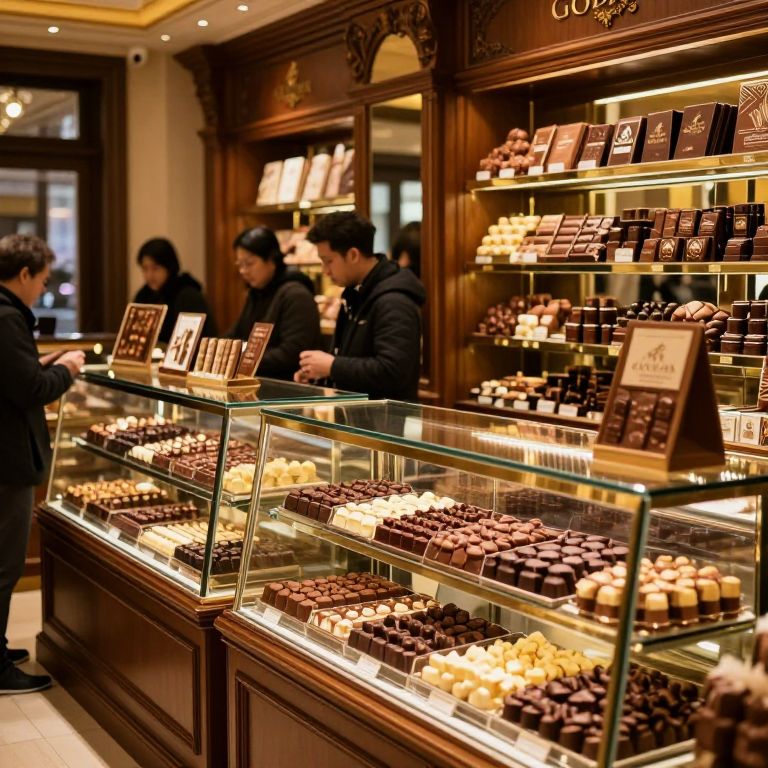 Photograph of a luxurious, well-lit chocolate shop with glass display cases filled with assorted chocolates, three Asian men in black coats browsing, wooden shelves