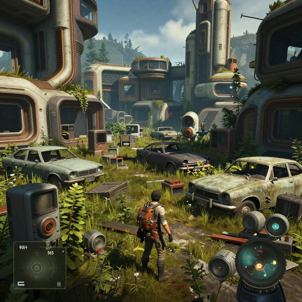 Fallout 5 gameplay exploration featuring a character scavenging an abandoned settlement filled with retro-futuristic technology and decayed vehicles, lush overgrowth reclaiming the world around, cinematic wide-angle view with intricate environmental details.
