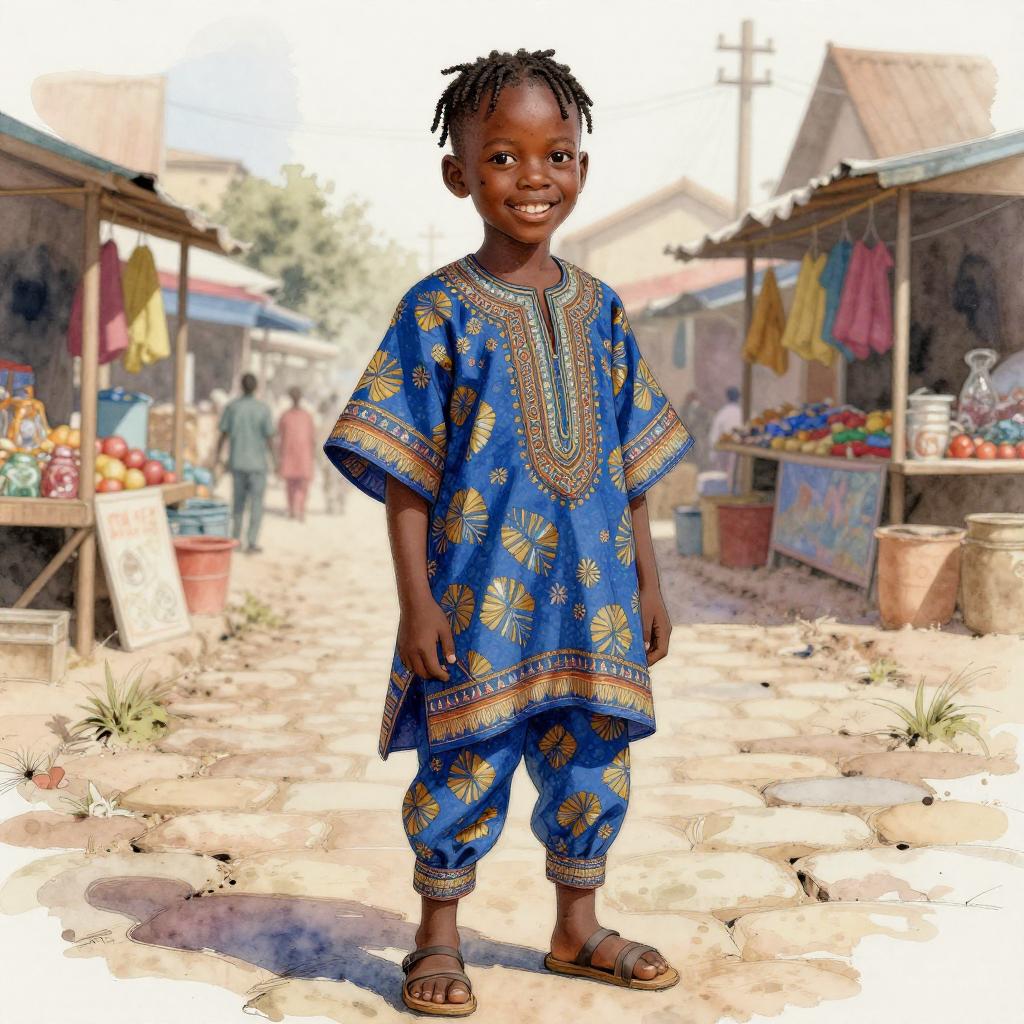 An artistic portrayal of a teenage West African boy with short twisted braids, warm deep-brown skin, a bright genuine smile and a small scar above his eyebrow, lively curious eyes dressed in a vibrant indigo and gold patterned agbada with wide flowing sleeves, handwoven kente trim, loose matching trousers and simple leather sandals, standing on a sunlit cobblestone street lined with colorful market stalls, rendered in a surreal watercolor and ink illustration with delicate wash gradients, fine expressive ink linework, soft pastel highlights, and a hint of iridescent gouache on the embroidery.